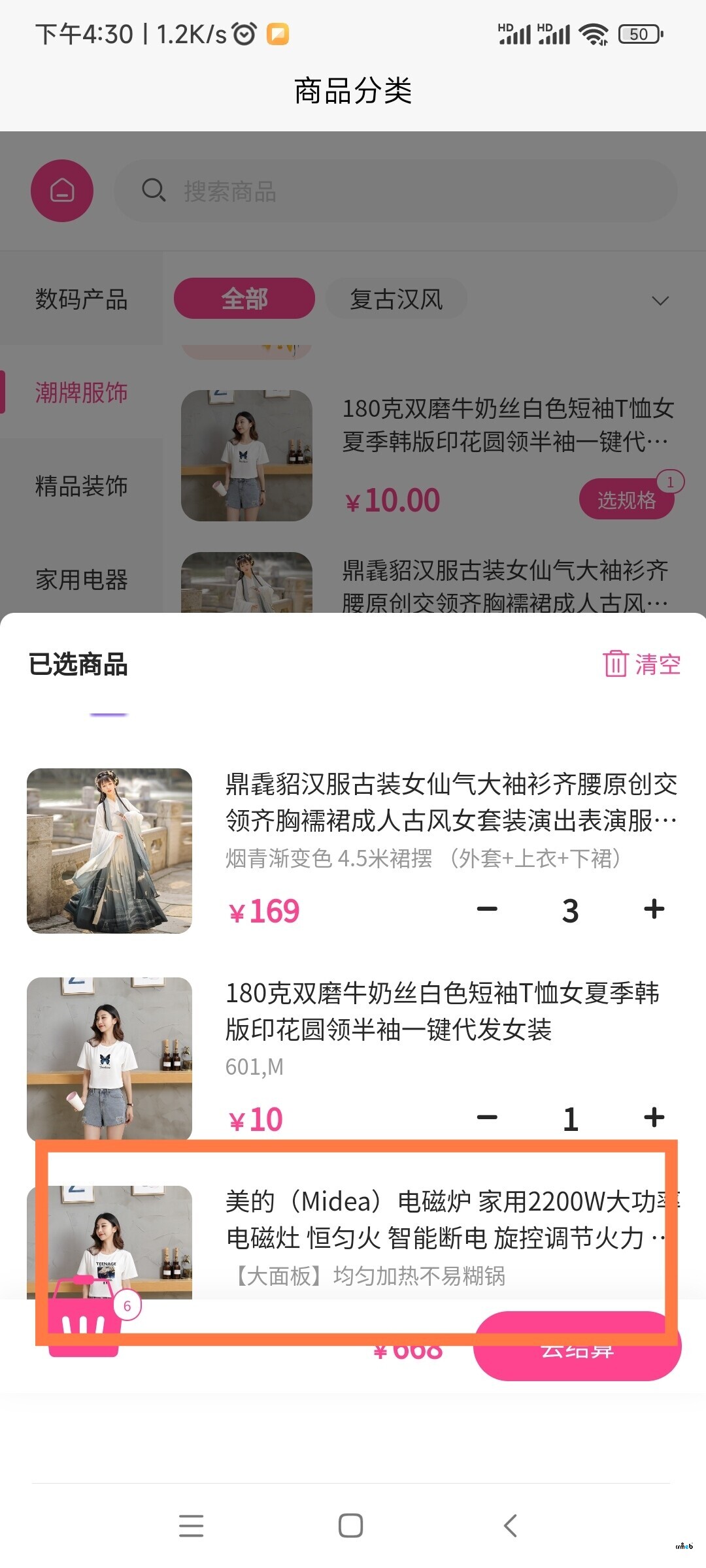 V4.4.4diy模板選擇類別頁面類別頁面樣式3,除了去結(jié)算按鈕不能貼底的問題外,購物車內(nèi)已選商品最下面的產(chǎn)品部分被遮擋,不能修改數(shù)量。請復(fù)現(xiàn)。 @CRMEB-吳汐 ? @CRMEB-ulo ?