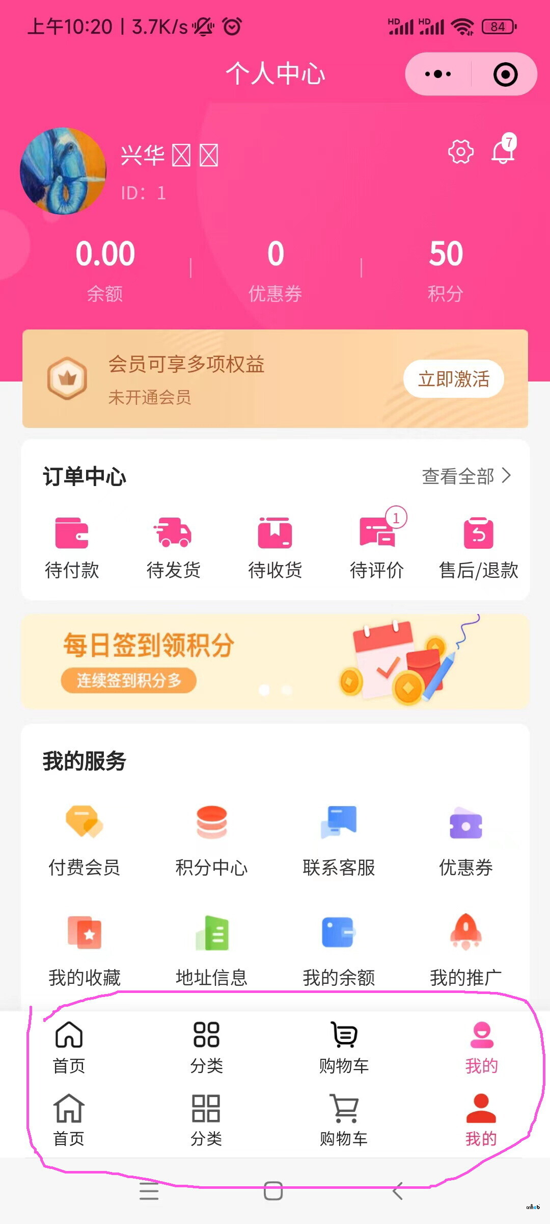 在小程序訂單通知中點(diǎn)擊訂單詳情進(jìn)入后,再點(diǎn)擊懸浮導(dǎo)航的用戶中心,會(huì)用戶中心頁面會(huì)出現(xiàn)重復(fù)的底部導(dǎo)航。 @CRMEB-吳汐 ?