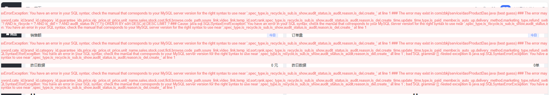 ; bad SQL grammar []; nested exception is java.sql.SQLSyntaxErrorException: You have an error in your SQL syntax; check the manual that corresponds to your MySQL server version for the right syntax to use near ',spec_type,is_recycle,is_sub,is_show,audit_status,is_audit,reason,is_del,create_' at line 1]